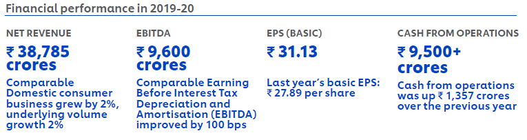 Given the disruptions to supply chain arising from COVID-19 in March 2020, for the full year 2019-20, Domestic Consumer Growth was 2% with Underlying Volume Growth of 2%. Our EBITDA margin improved by 100 bps on comparable basis, PAT , grew by 11% to Rs. 6,743 crores and PAT at ` 6,738 crores was up by 12%. We sustained our track record of strong cash generation.