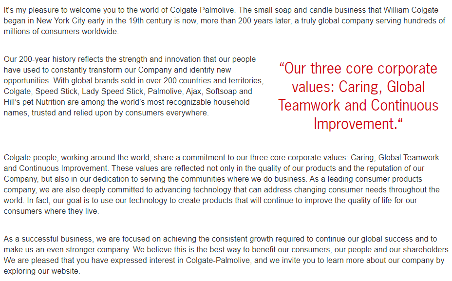 We are Colgate-Palmolive, a caring, innovative growth company that’s re-imagining a healthier future for people and our planet. Our three fundamental values – Caring, Teamwork, and Continuous Improvement – are a part of everything we do. These values are reflected not only in the quality of our products and the reputation of our Company but also in our dedication to serving the communities.